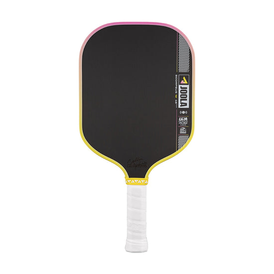JOOLAの新技術「テックフレックスパワー(TFP)」を搭載した【限定カラー】コリン・ジョンズ スコーピアス プロ IV 16mmは、守備型プレイヤーに最適な選択肢です。テクスチャードカーボンファイバーサーフェスとプロパルションコアがパワーと精度を高め、ドライブ、スピードアップ、ディンク間の移行を容易にします。最適化された重量配分により疲労軽減とミスショットの最小化を実現し、試合に臨む自信をもたらします。